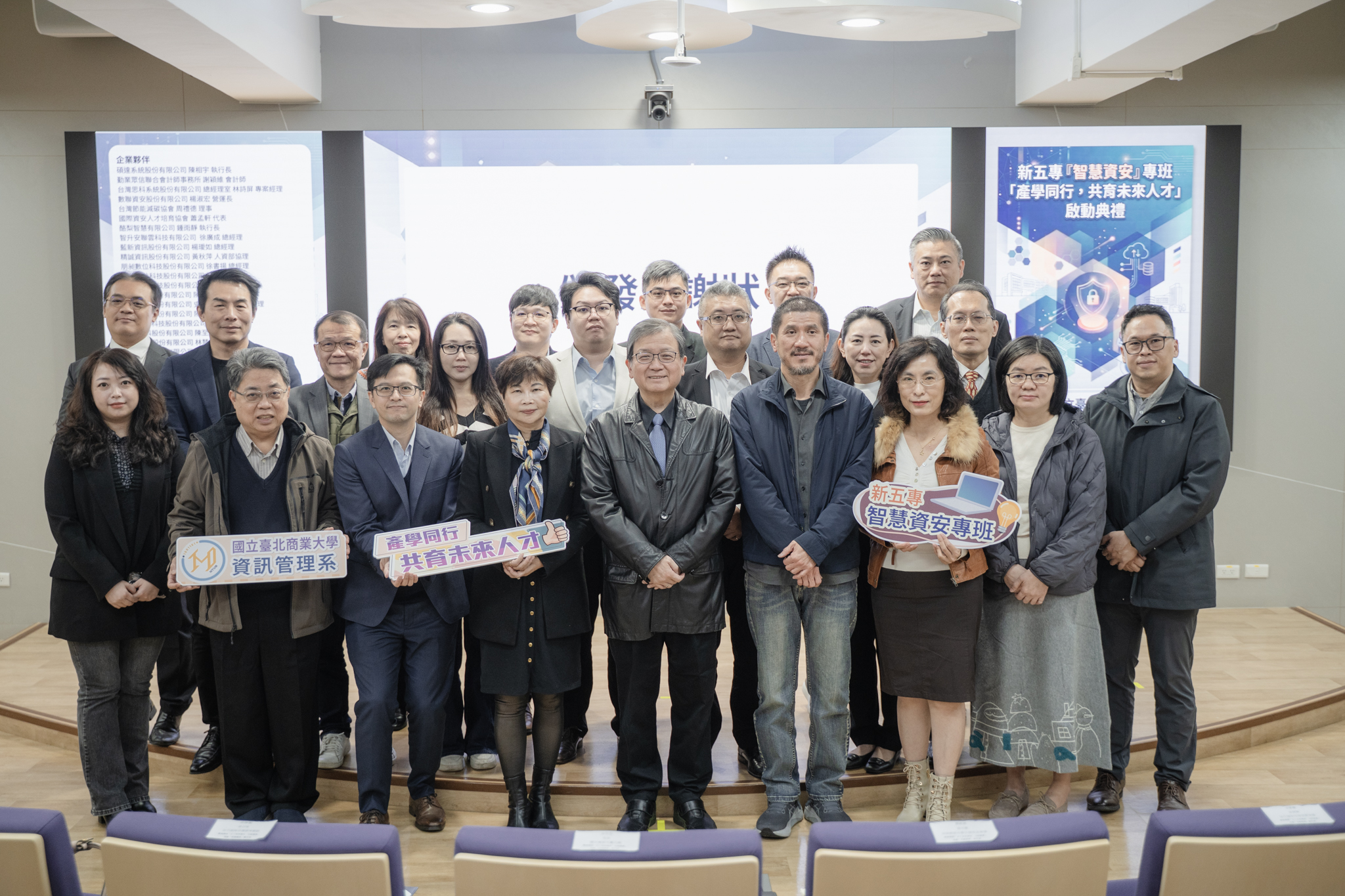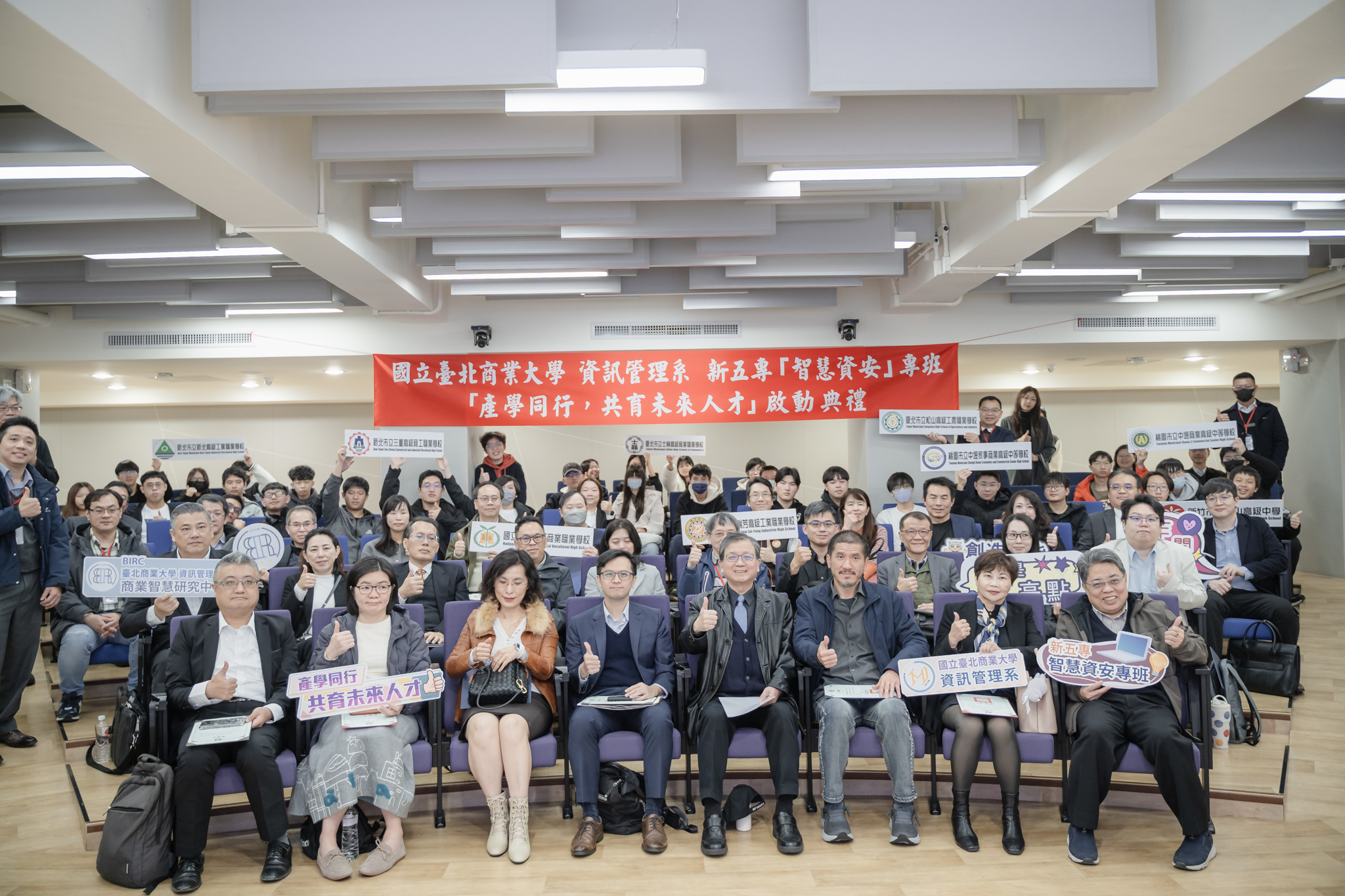 國立臺北商業大學資訊管理系因應數位轉型與資安人才需求,攜手產學夥伴及技高端學校,共同推動新五專「智慧資安」專班計畫,並於 115年2月3日上午10時舉行「產學同行,共育未來人才」專班啟動典禮,象徵產、學合力,長期且系統化培育智慧資安人才正式啟航。本次啟動典禮現場匯聚多家資安與科技相關企業高階主管,以及技高端學校師長與學生代表,共同見證產學共育的重要里程碑。
