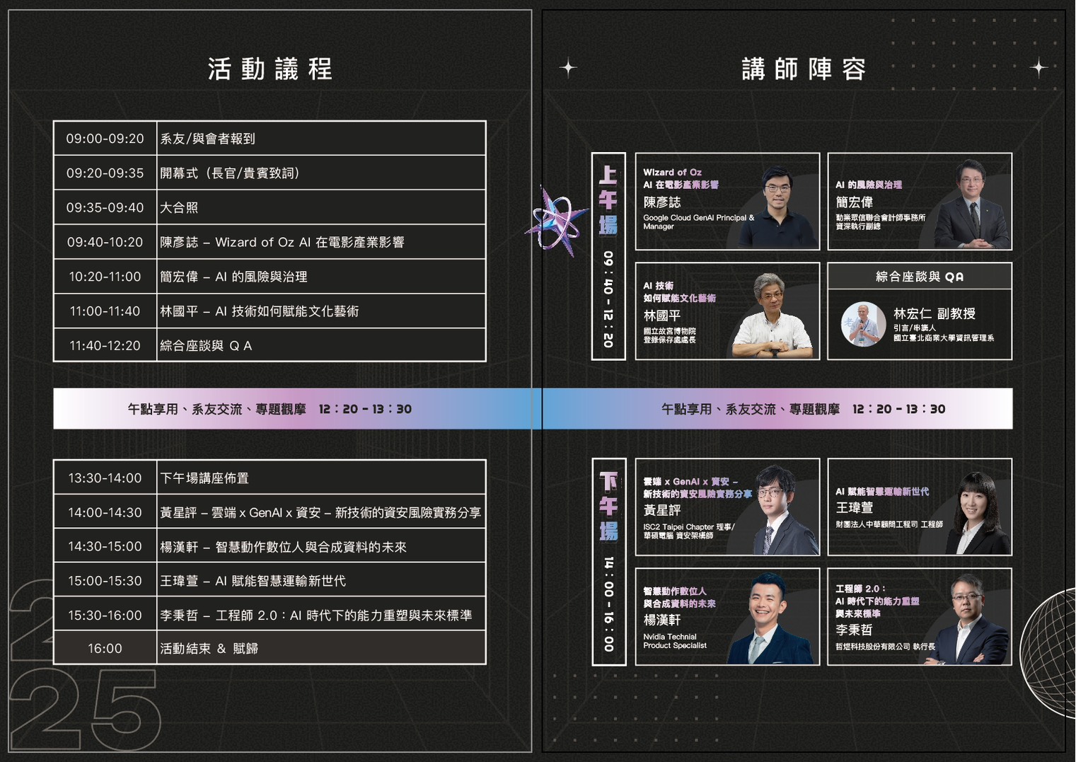 非常榮幸邀請到三位優秀系友擔任講者,探討 AI 對資訊業的機會與挑戰。