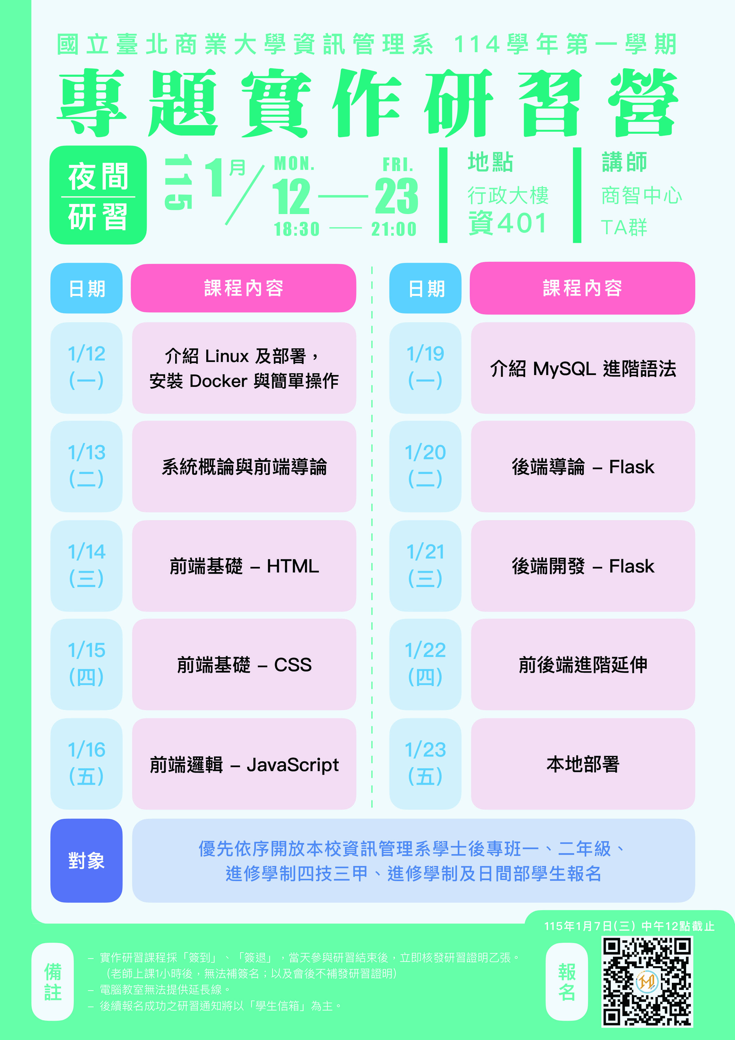 【公告】 國立臺北商業大學資訊管理系114學年第1學期專題實作研習營(夜間研習)