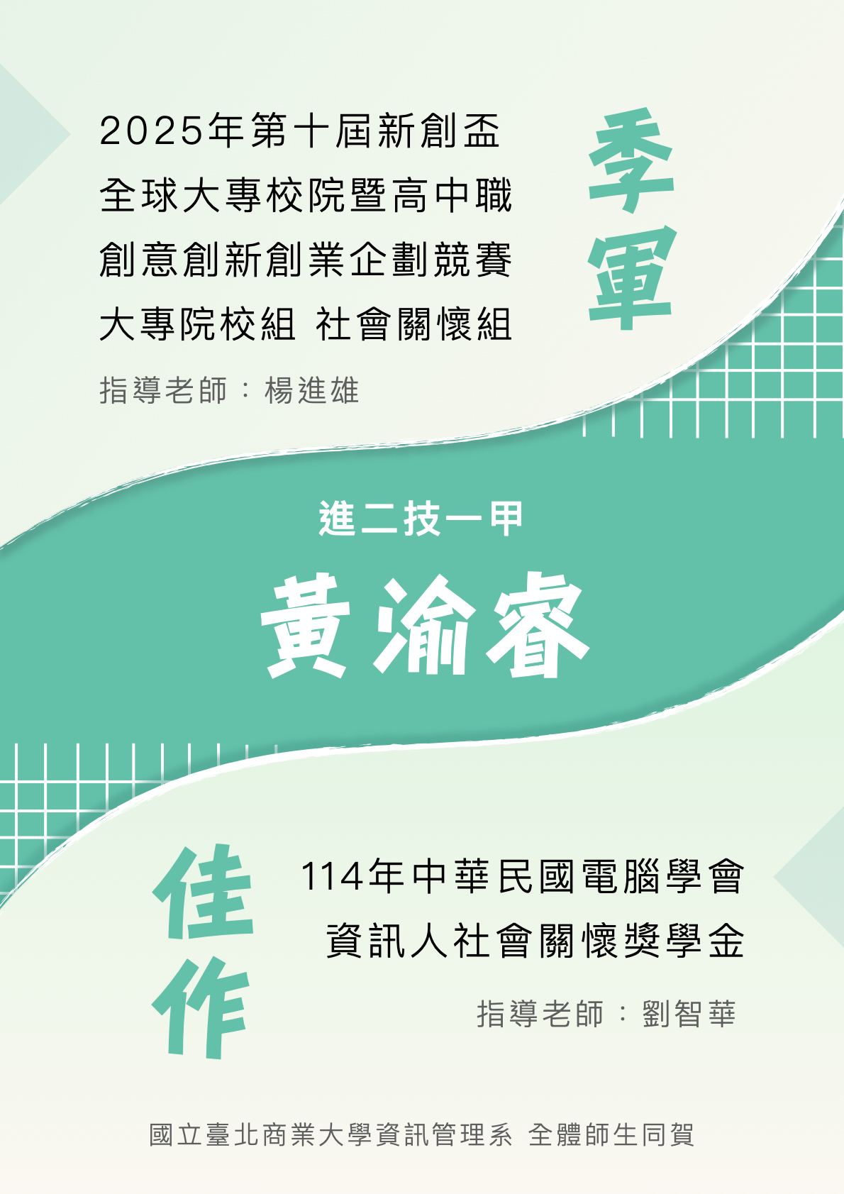 【恭賀】進二技一甲黃渝睿榮獲2025新創盃全球大專校院暨高中職創意創新創業企劃競賽、 中華民國電腦學會資訊人社會關懷獎學金