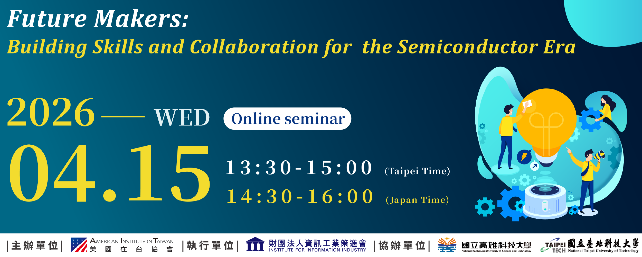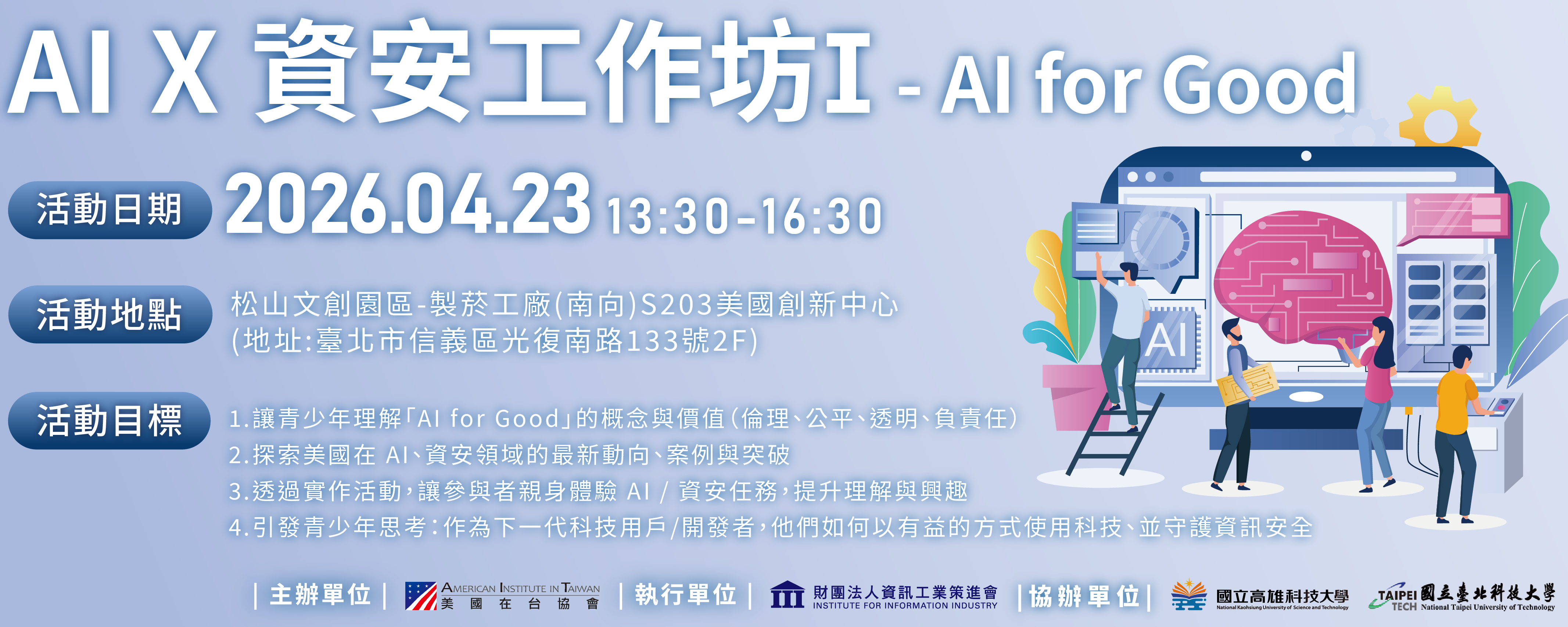 一、資策會與AIT美國在台協會合作推動AI、資安及半導體人才培訓,透過辦理以下活動為台灣青少年提供人工智慧和網路安全技能。 二、活動資訊: (一)、線上論壇: 1.活動名稱:「未來創客:建構半導體時代的技能與協作(Future Makers: Building Skills and Collaboration for the Semiconductor Era)」。 2.活動時間:中華民國115年4月15日(三)下午13:30~15:00。 3.報名時限:自即日起至115年4月10日(五)止。 4.報名網址:https://ievents.iii.org.tw/EventS.aspx?t=0&id=3142。 (二)、實體工作坊: 1.活動名稱:「AI x 資安工作坊Ⅰ- AIfor Good」。 2.活動時間:中華民國115年4月23日(四)下午13:30~16:30。 3.活動地點:松山文創園區-製菸工廠(南向)S203美國創新中心,地址:臺北市信義區光復南路133號2F。 4.報名時限:自即日起至115年4月17日(五)止。 5.報名網址:https://ievents.iii.org.tw/EventS.aspx?t=0&id=3125